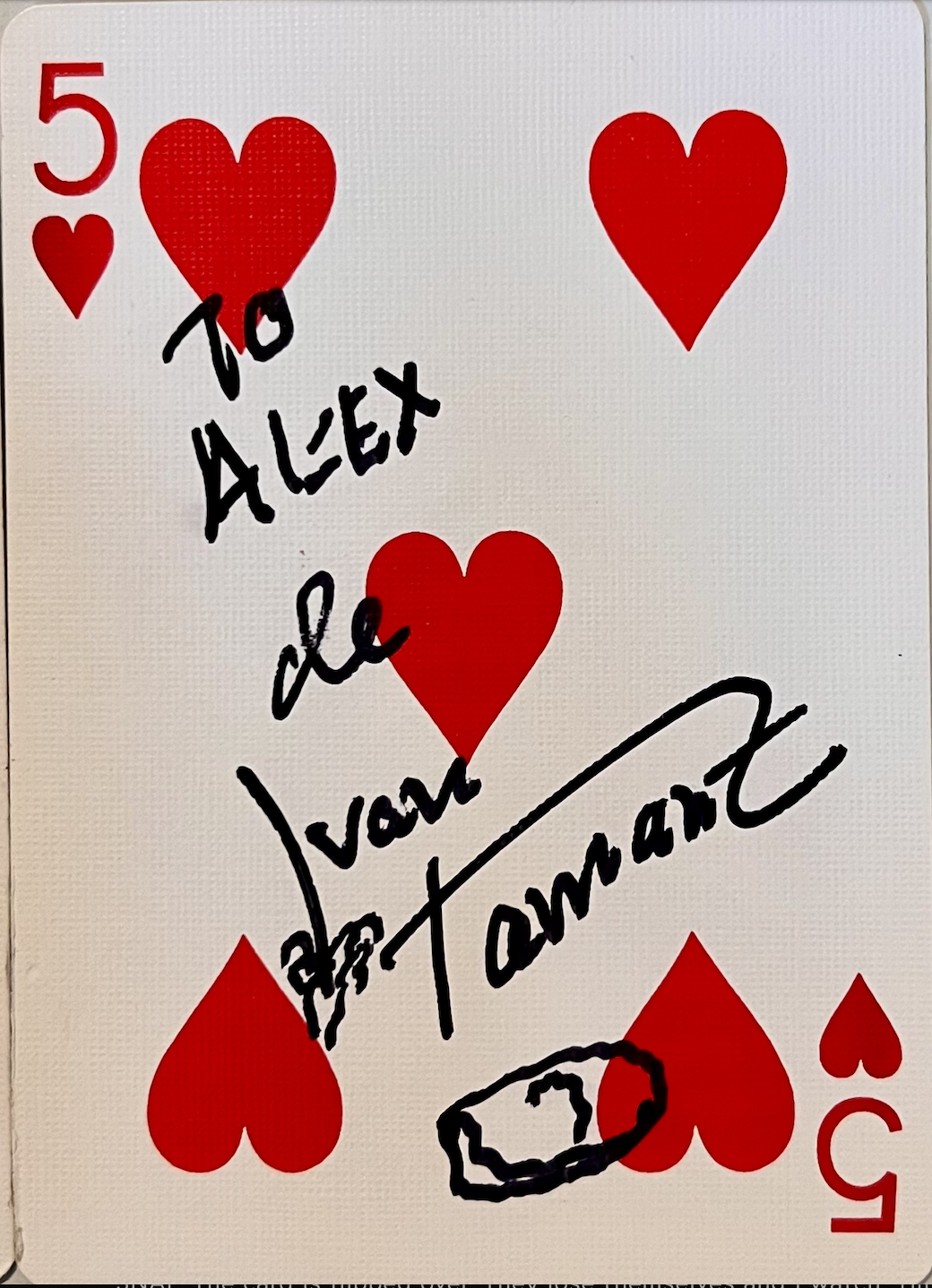 When it’s summer in southern California and yet the heat is on something strange is happening. It’s so damn hot in the room at 1am that I’m sweating in a t-shirt. But that’s how Juan likes the room so that’s how it will be. And funny enough, I’m cool with that. The six of us have flown from around the country for three nights with Juan Tamariz. He teaches. He shows us his notes. He answers questions. He asks questions. He is magic. Some lessons he knows are best experienced than explained. We enter the room and a deck of cards has been cut into three piles on the table and each is laid into the shape of a star. “This is magic that is so good that this is the three Michelin star trick!” He stands in the doorway and removes his shoe. “If I step over the shoe to try and touch anything you stop me. Say ‘Juan- No!’ You must prevent me.” He asks me to name a card. The Five of Hearts. Any pile is chosen and he proclaims the card is not there. He’s right! Another pile is chosen and the card is not there either. He tries to sneak over the shoe “No Juan!” He sheepishly backs away and grins. He doesn’t touch the cards and yet the card is gone from the entire deck. It was just simply gone. “Point anywhere you like.” The one sitting next to me points to Juan’s breast pocket. “Not my hat? Not behind the painting. Not the cup on the counter?” The pocket. Juan gets quieter and slows down. Tension. She reaches into his pocket and removes the only card. Slowly it’s flipped over. The Five of Hearts. We erupt in a release. He didn’t teach us this one. But the signed Five of Hearts with a shoe drawn on it came home with me. How does he make it feel like magic?